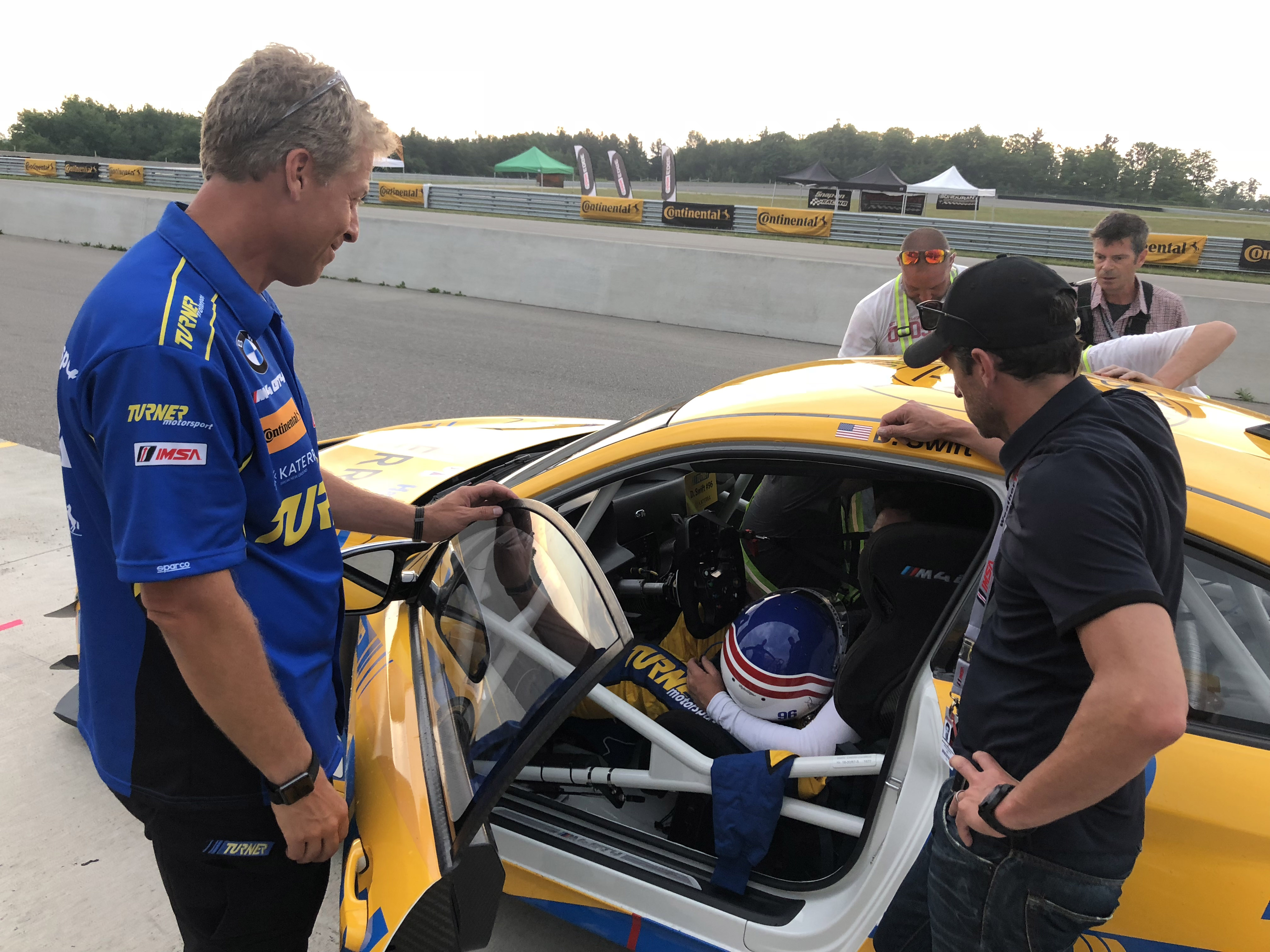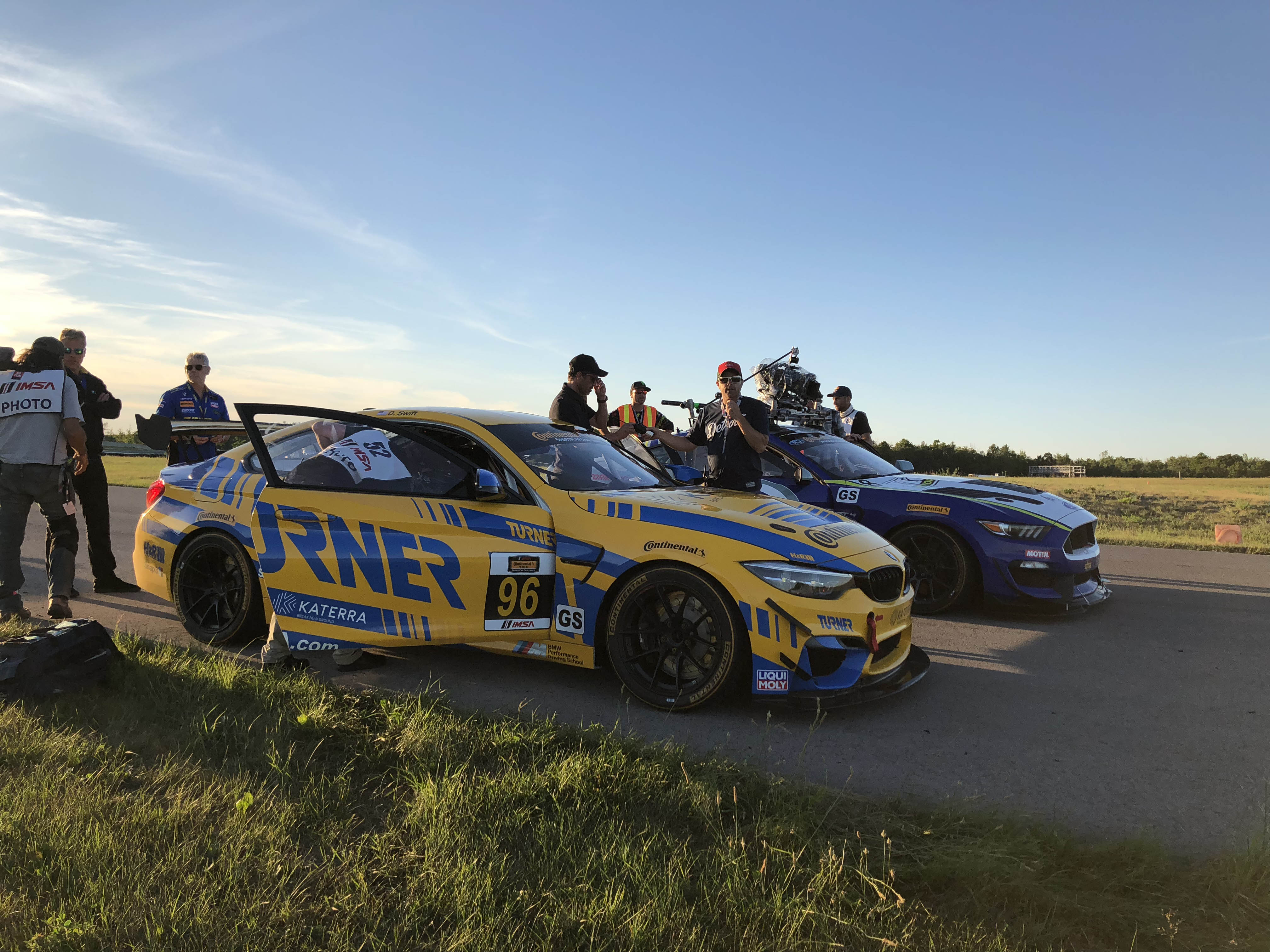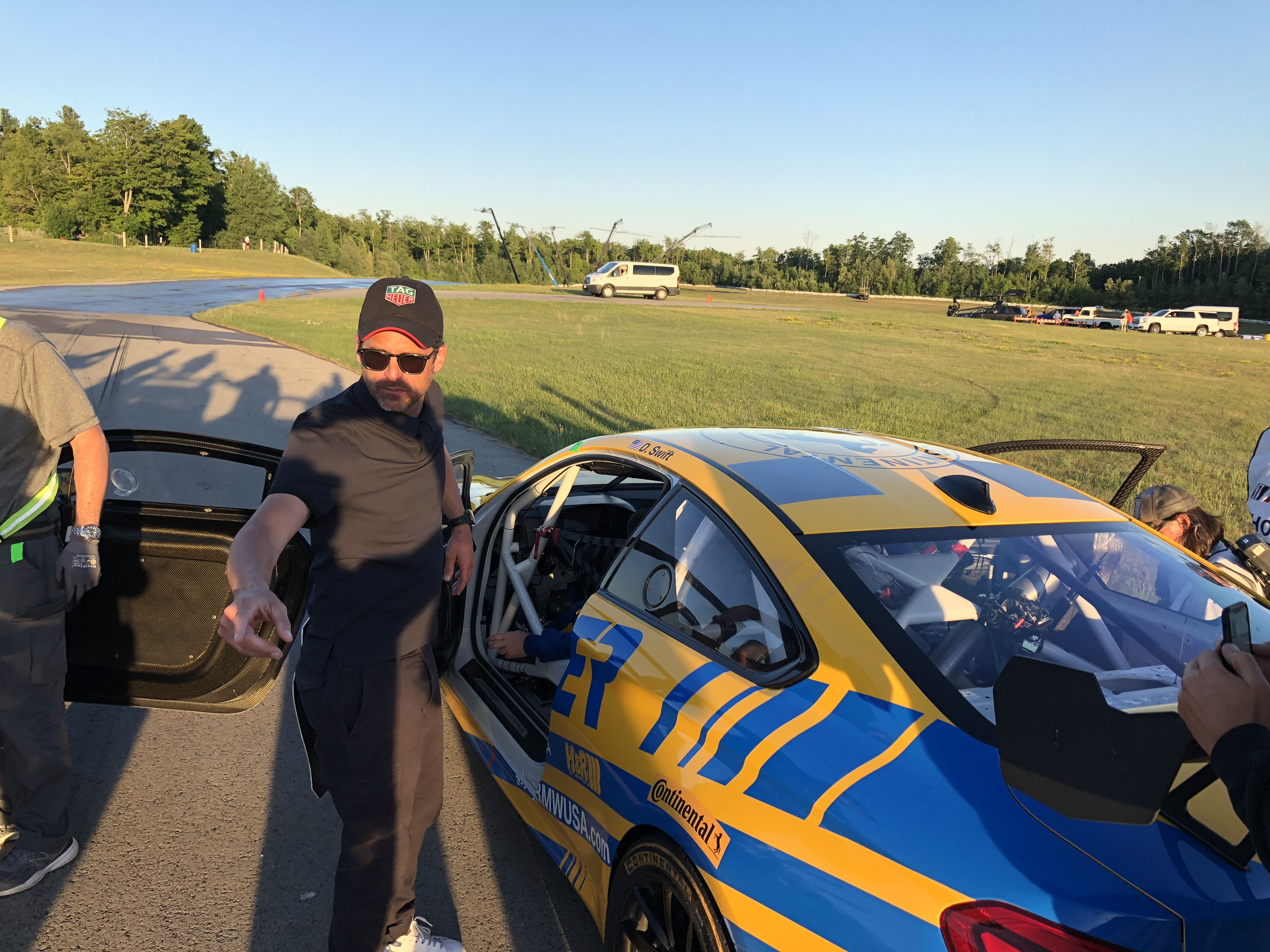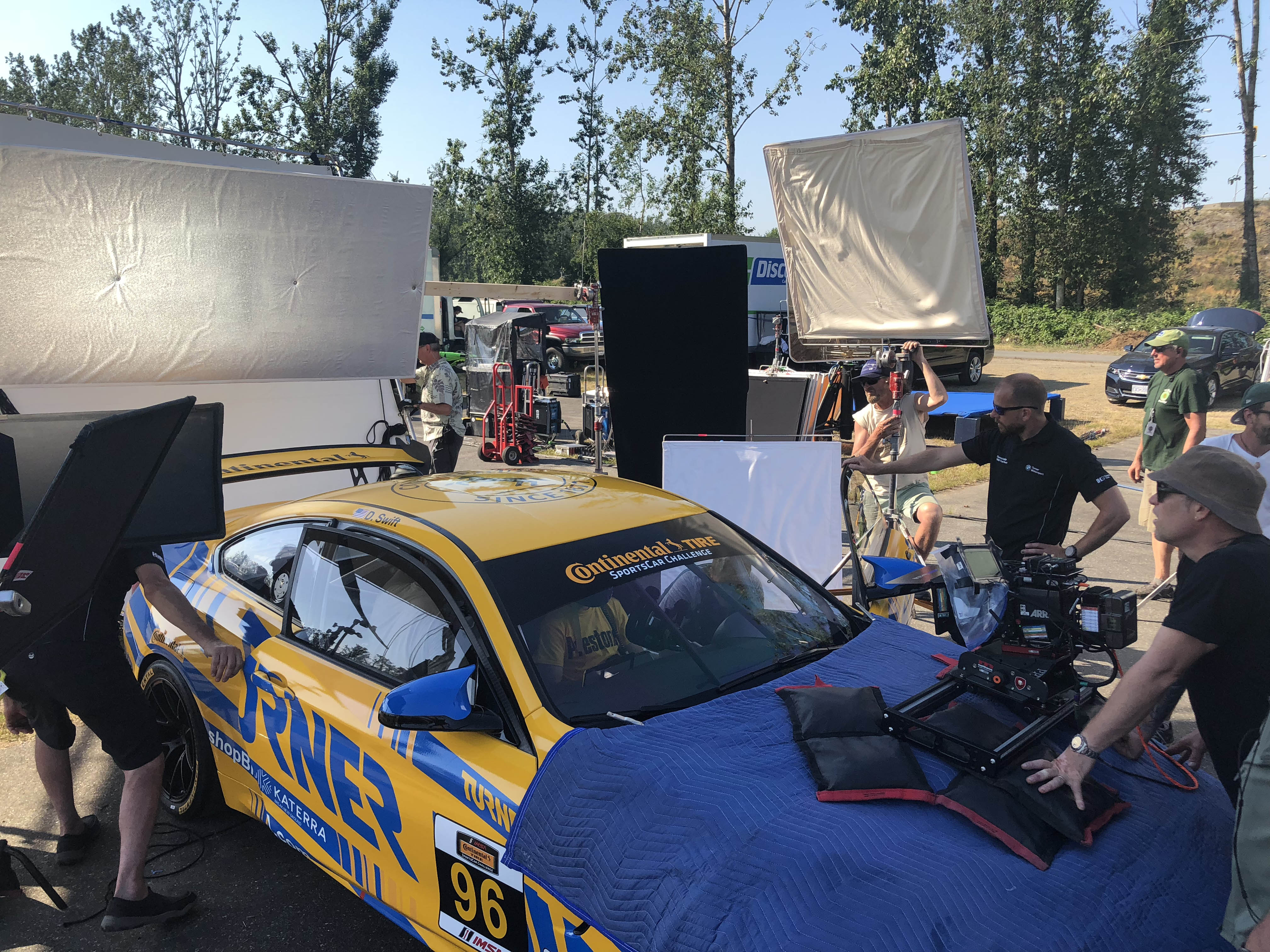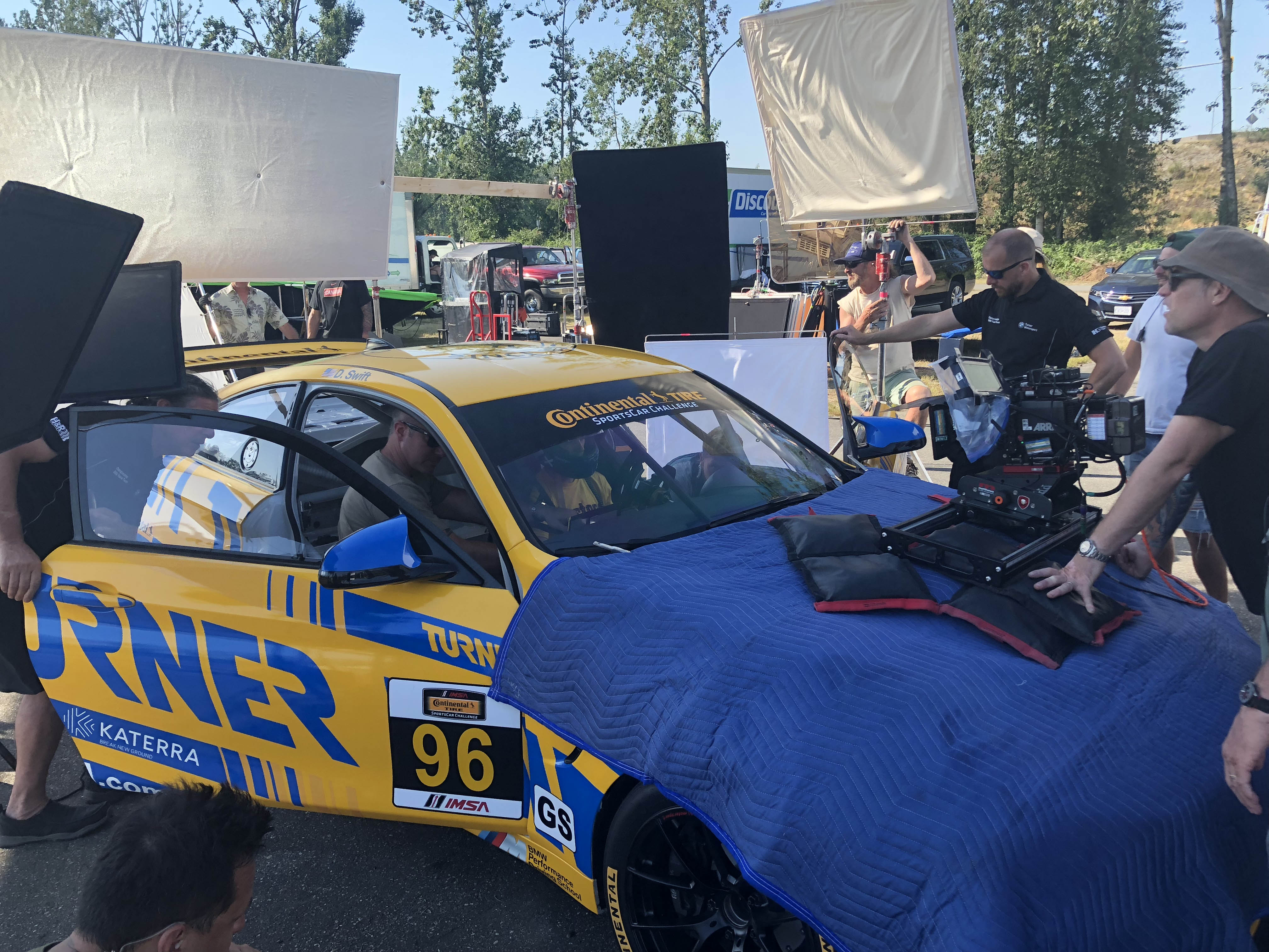 Now for the really cool part, Patrick and his colleagues offered Turner Motorsport to be in the main race scene. Milo Ventimiglia who plays the main character Denny, will be driving the Turner BMW in the pivotal race when a raindrop hits the windshield the call is made to duck into the pits to get rain tires on before his competitors do. The actual Turner Motorsport pit crew performs the pit stop and tire change to get Denny back out on track. Denny then races through the field in the Turner BMW and in the end, takes the win. Denny is dressed in full Turner Motorsport gear and car is featured the iconic blue and yellow Turner livery. Denny and car will make it to victory circle helping to launch Denny’s professional racing career.